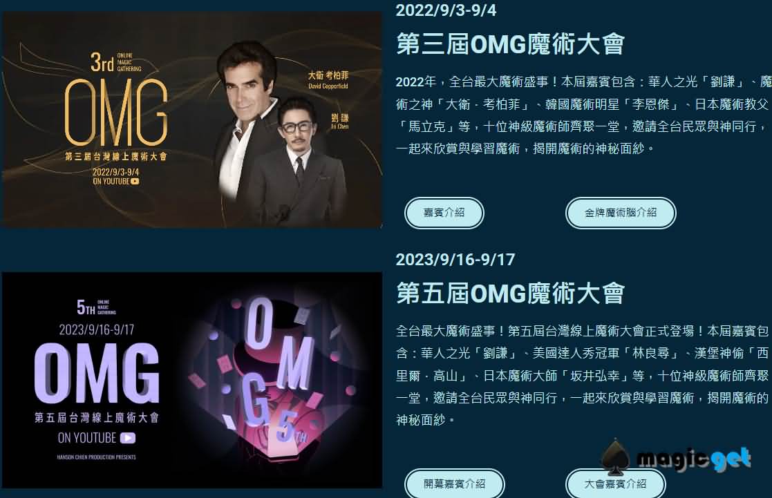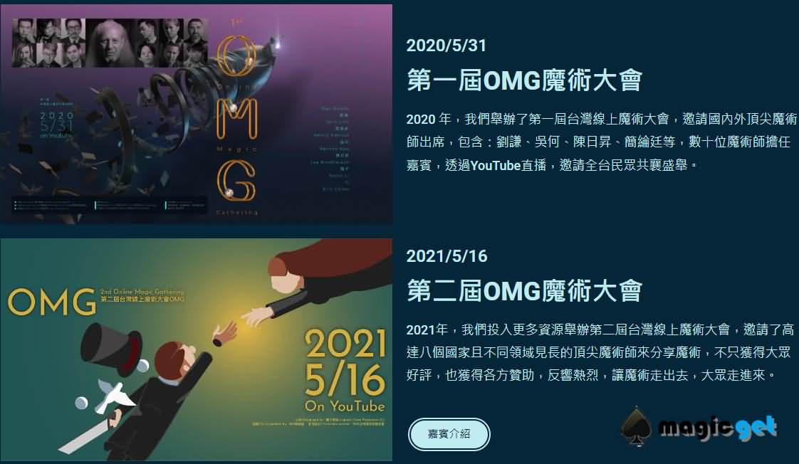 OMG 大会,台湾线上魔术大会 OMG(1st online magic gathering),由简子制造作主办,808 魔术店及 TMA 台湾魔术发展协会协办,是疫情下诞生的线上魔术盛会。