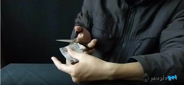 2. 你拿出一把普通剪刀,当着所有人的面,把签了名的纸币剪成 3-4 段,还能把碎片递给前排观众看一眼;